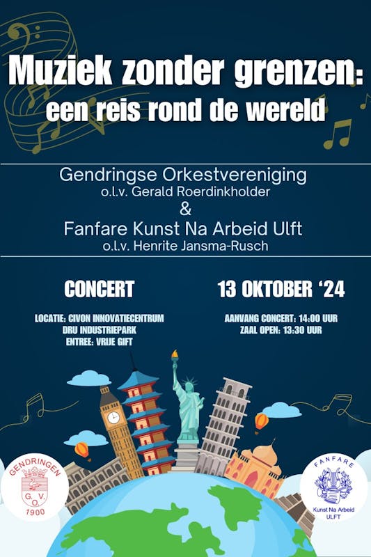Fanfare Kunst Na Arbeid en Gendringse Orkestvereniging zullen u meenemen op een muzikale reis rond de wereld. Middels verschillende muziekstukken worden alle delen van onze wereld ontdekt.