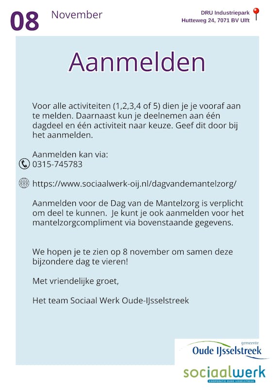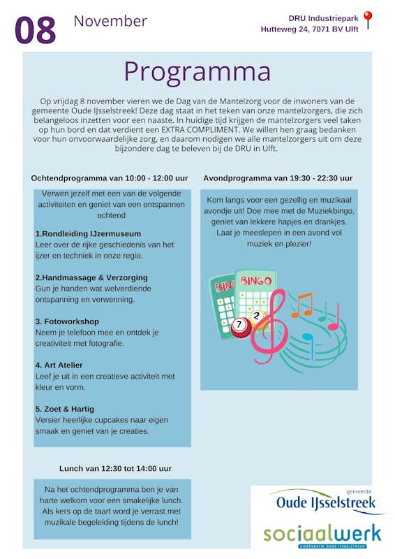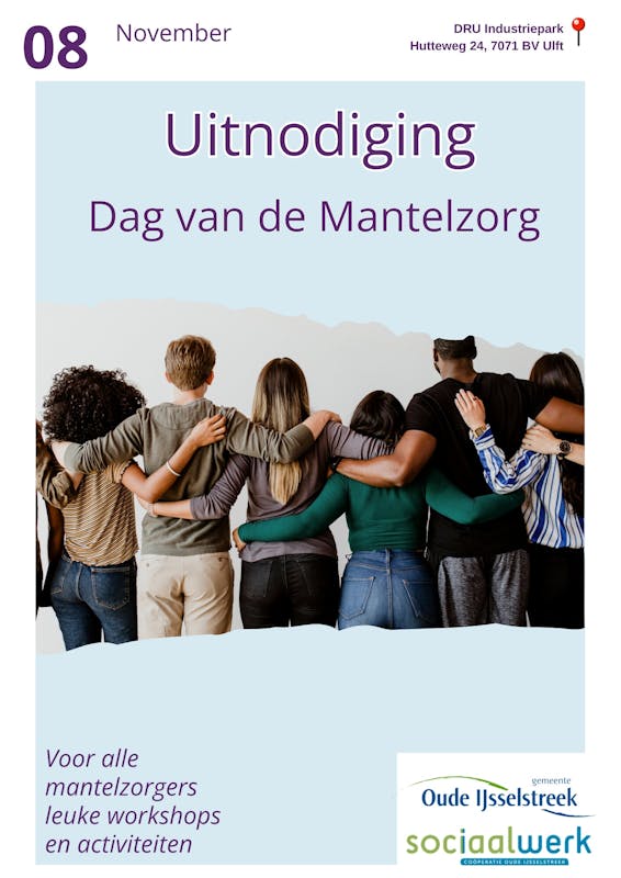 Op 8 november 2024 organiseert Sociaal Werk Oude IJsselstreek de Dag van de Mantelzorg bij de DRU in Ulft. Een dag om onze mantelzorgers in het zonnetje te zetten en hen te bedanken voor hun geweldige inzet!