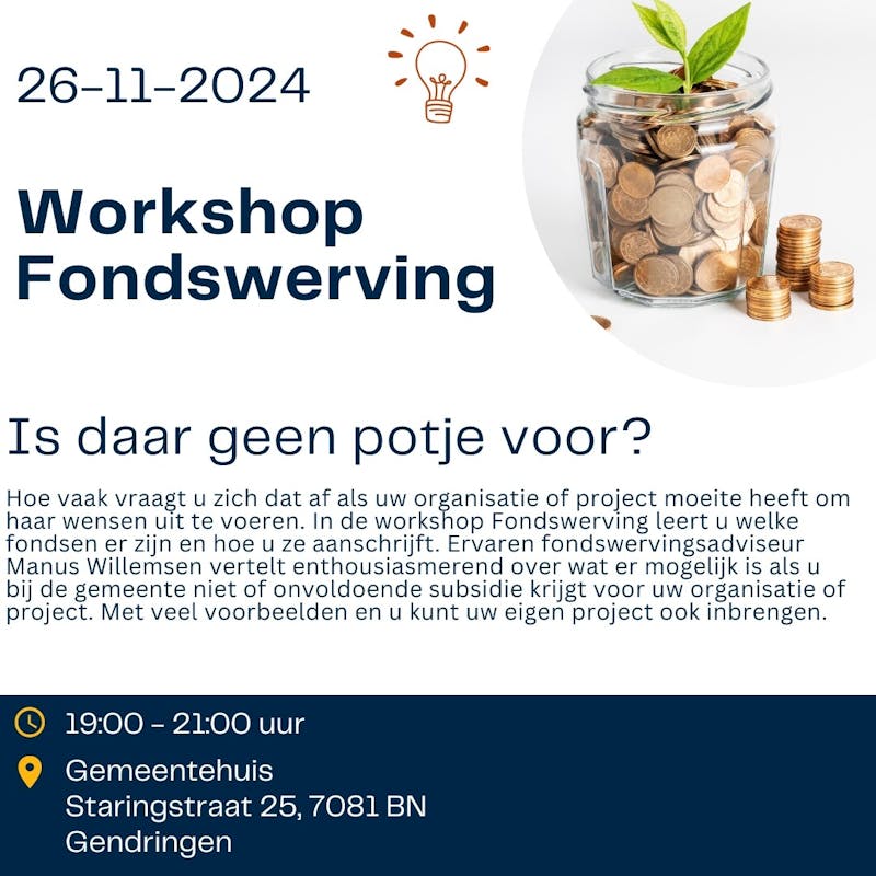 Is daar geen potje voor? Hoe vaak vraagt u zich dat af als uw organisatie of project moeite heeft om haar wensen uit te voeren. In de workshop Fondswerving leert u welke fondsen er zijn en hoe u ze aanschrijft. Ervaren fondswervingsadviseur Manus Willemsen vertelt enthousiasmerend over wat er mogelijk is als u bij de gemeente niet of onvoldoende subsidie krijgt voor uw organisatie of project. Met veel voorbeelden en u kunt uw eigen project ook inbrengen.