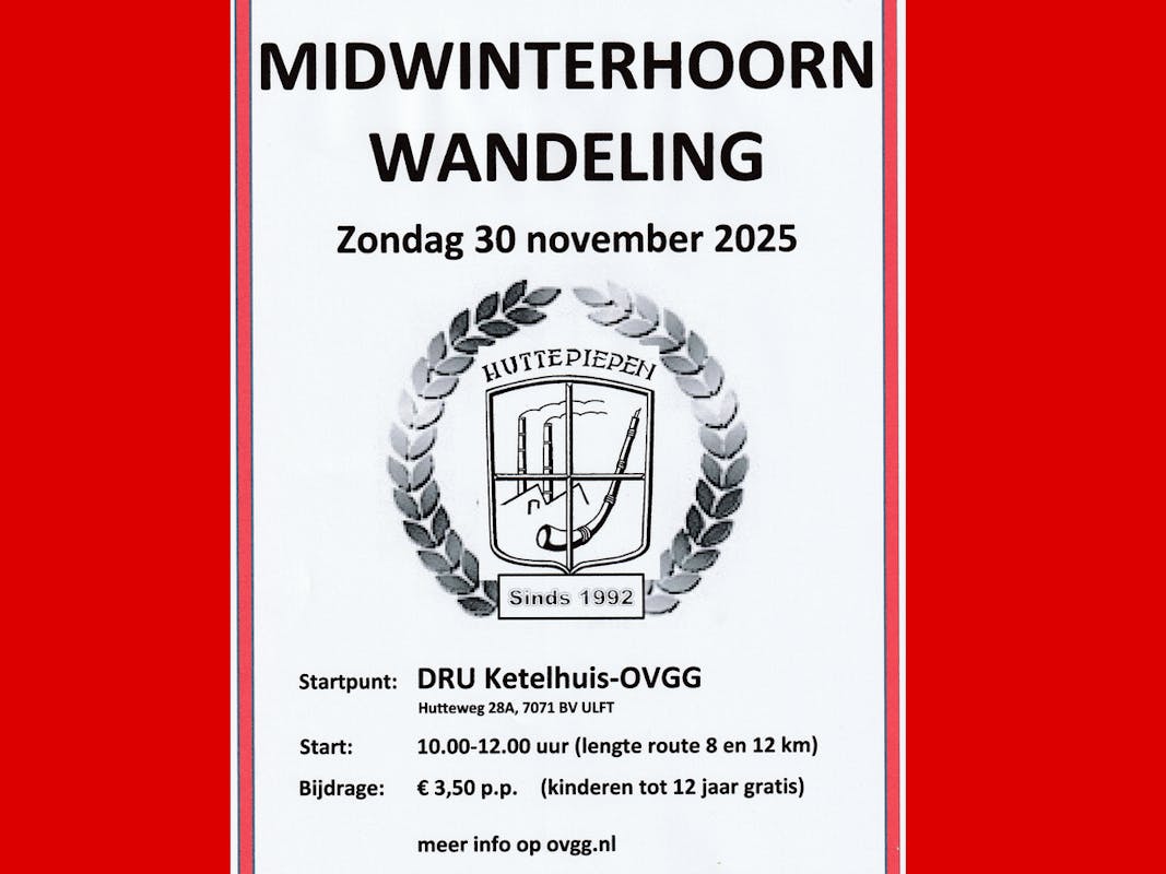 Zondag 30 november is de eerste zondag van de advent en kunnen wandelaars weer een mooie route individueel lopen waar de klanken van de midwinterhoorn centraal staan. De organisatie is in handen van midwinterhoorngroep De Huttepiepen, een werkgroep van de Oudheidkundige Vereniging OVGG, die haar zetel heeft in het Ketelhuis op het DRU Industriepark in Ulft.