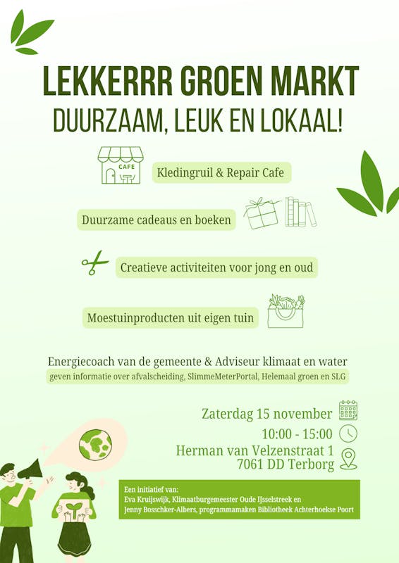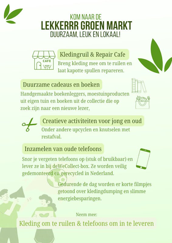 Ontdek hoe je eenvoudig duurzamer kunt leven tijdens de inspiratiemarkt Lekkerrr Groen in Bibliotheek Achterhoekse Poort. Lever je oude smartphone in voor WeCare en help digitale apparaten een tweede leven te geven. Doe mee aan de kledingruil – ruim deze week je kast op en ruil volgende week! Verder: Repair Café, upcycle-ideeën, knutselen met restafval, verkoop van duurzame boekenleggers en moestuinproducten, plus informatie van partners zoals Gemeente Oude IJsselstreek en SLG. Gratis toegang, veel inspiratie!