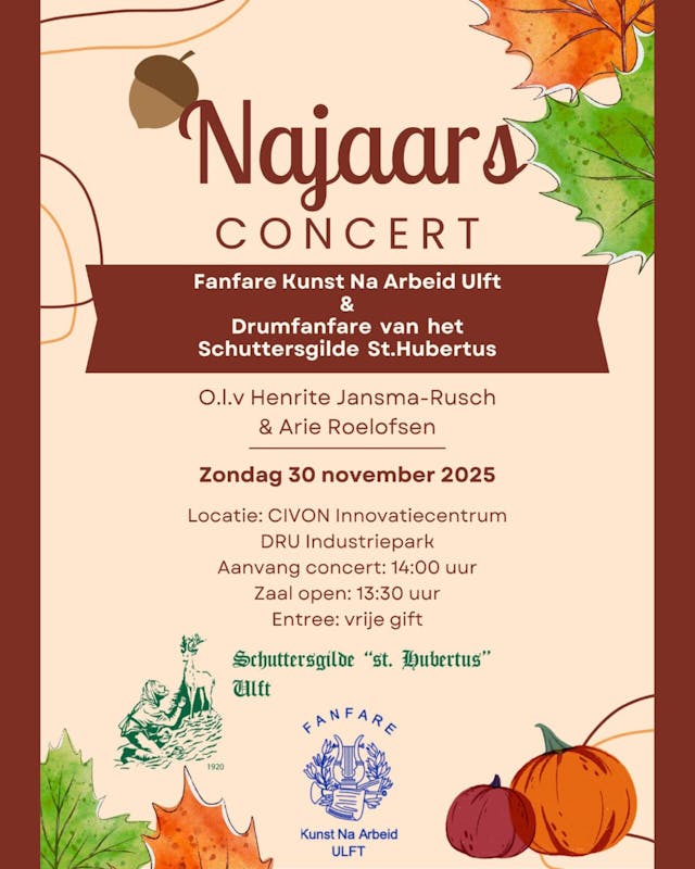 Een unieke muzikale samenwerking: Fanfare Kunst Na Arbeid samen met de drumfanfare van Schuttersgilde Sint Hubertus! Beide verenigingen zullen zowel zelf als gezamenlijk heerlijke luister en meezing muziek ten gehore brengen. De toegang is gratis, maar een vrije gift wordt gewaardeerd!